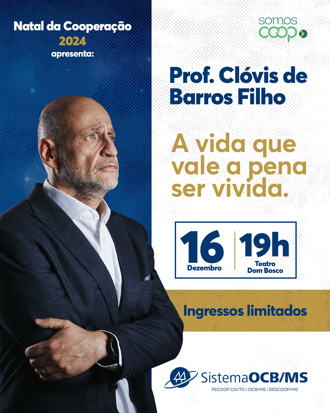 Para celebrar o encerramento do Natal da Cooperação, o Sistema OCB/MS promove a palestra “A vida que vale a pena ser vivida” com professor Clóvis de Barros FIlho no dia 16 de dezembro, às 19h, no Teatro Dom Bosco, localizado na Av. Mato Grosso, 225.
